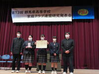 1/21(水)家庭科クラブ連盟研究発表会に3年福祉サービスコースが参加し、「万場防災プロジェクト(MANBOプロジェクト)」で最優秀賞を受賞しました。かつて神流町は台風による被害で孤立したことがあります。そのため防災意識を高める必要があり、地元ケーブルテレビを利用した放送やポスター、ローリングストックを促すためのレシピ集作成に取り組んだことを発表しました。ご協力いただいた方々や神流町役場に感謝します。